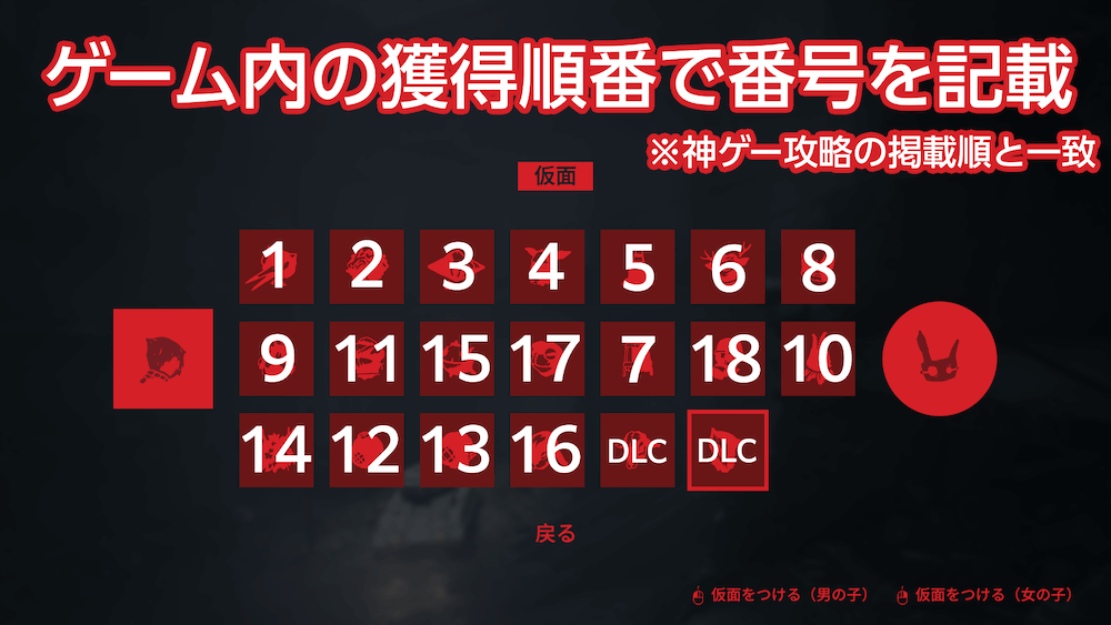 仮面の獲得順番は、ゲーム内で確認できる仮面一覧とは一致しない。獲得できていない仮面がある場合、上記の画像と照らし合わせて獲得できなかった仮面を判断して探しに行こう。