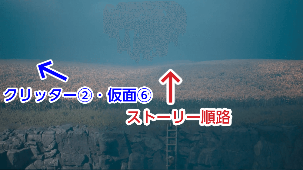 木箱を落とした後に外へ出た時、海岸を左上方向へ進もう。赤いランプの先にクリッターが出現しており、倒すと仮面を獲得できる。