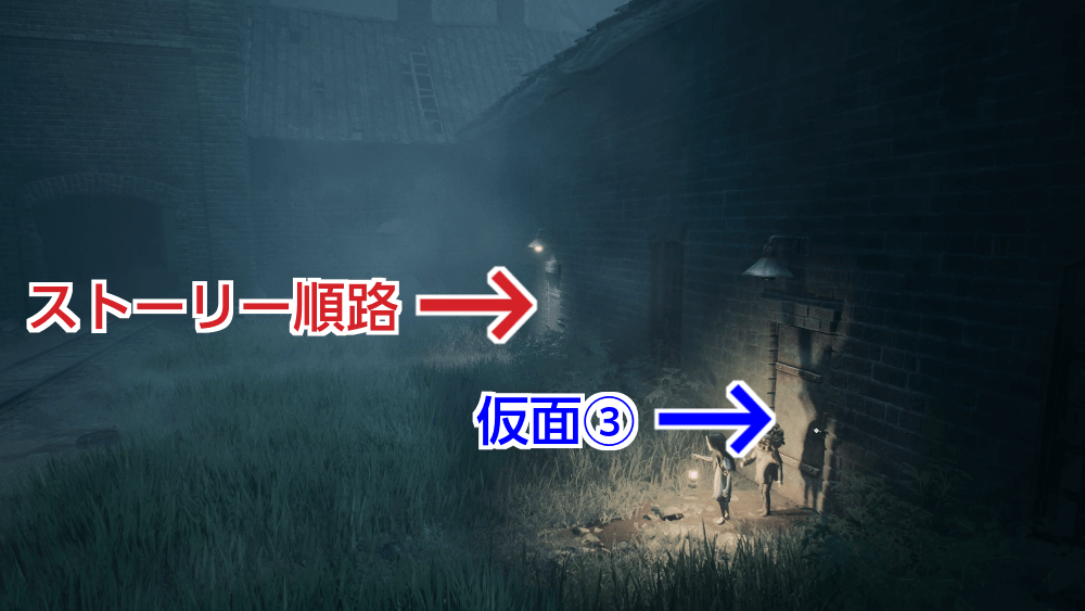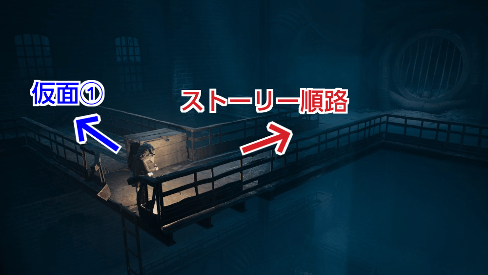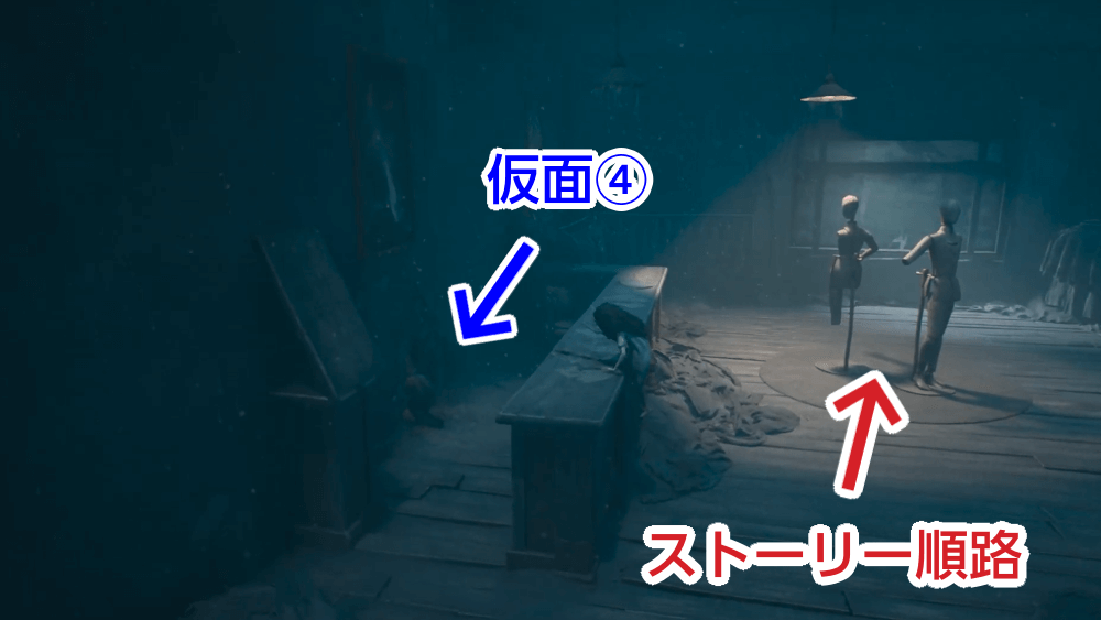 隠し部屋の左奥に仮面が落ちている。拾ってから部屋を出て、ストーリーの順路へ戻ろう。