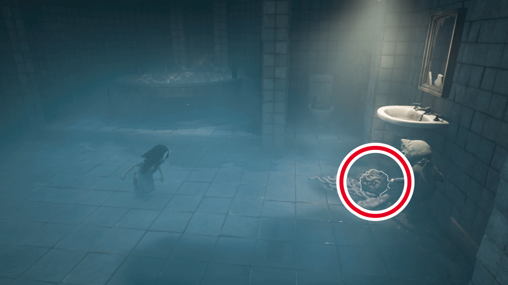 ロッカーからバスルームに入ったら右側へ進もう。奥の洗面台下に仮面が落ちている。