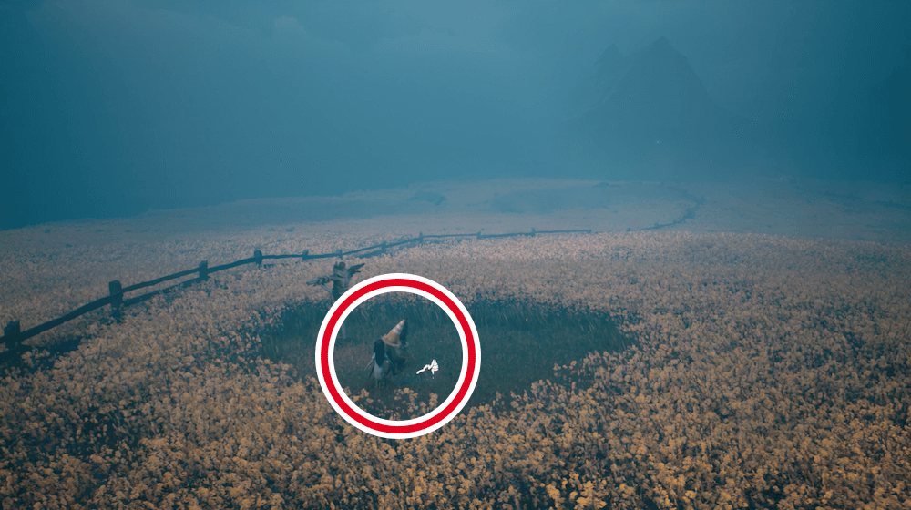 画面手前側にある隙間をくぐると、地面に植物のような物体がある。物体を調べると仮面を獲得可能だ。
