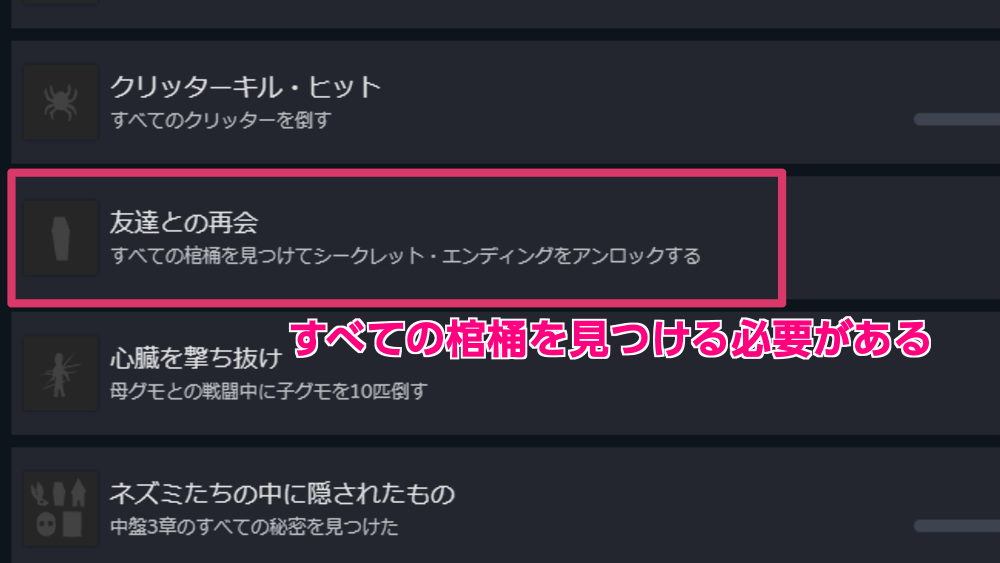 リアニマルのストーリーには、シークレットエンディングが存在する。解放条件にすべての棺桶を見つけるとあるため、ストーリーを進める際は常に周囲をチェックしておこう。
