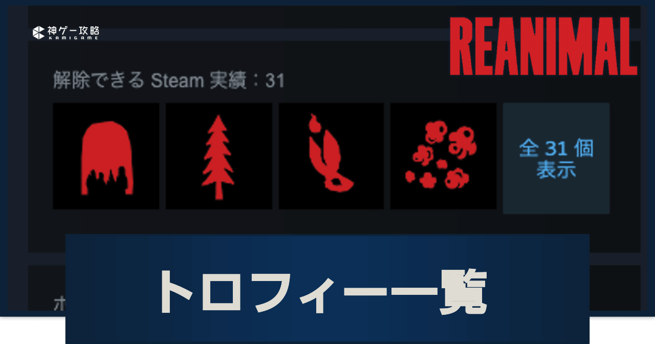 リアニマル(REANIMAL)の「トロフィー一覧」を掲載。リアニマルの実績やクリア方法についても解説しています。