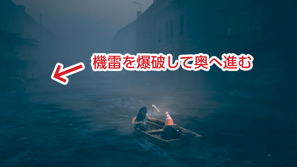 水路左側にある機雷を銛で破壊しよう。二つ横に並んでいる機雷が目印だ。