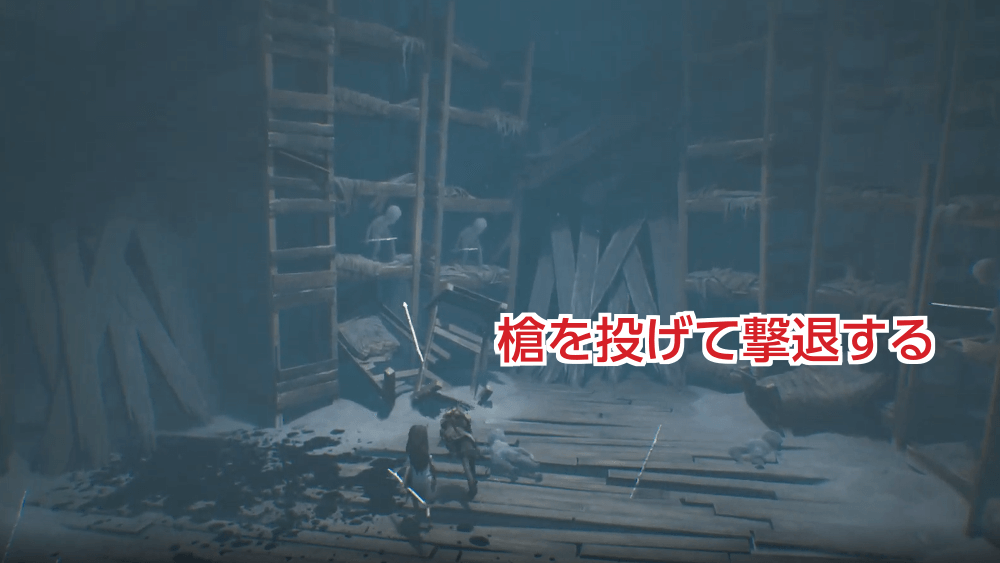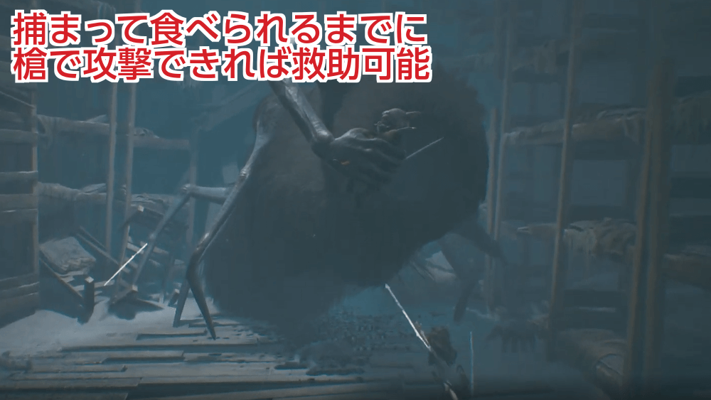 母グモに捕まった際、槍で攻撃できれば救助が可能だ。1人プレイでは女の子が槍を投げてくれれば助かるが、女の子と槍までの距離が離れていると救助できずそのまま捕食されてしまう。協力プレイでは仲間と連携できるため、救助成功させやすい。