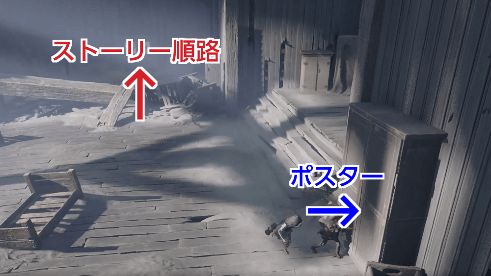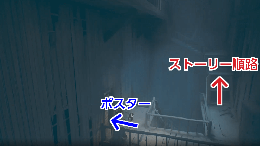 階段途中の扉を開けるとバルコニーにポスターが貼ってある。収集要素を集めたい人は獲得しておこう。