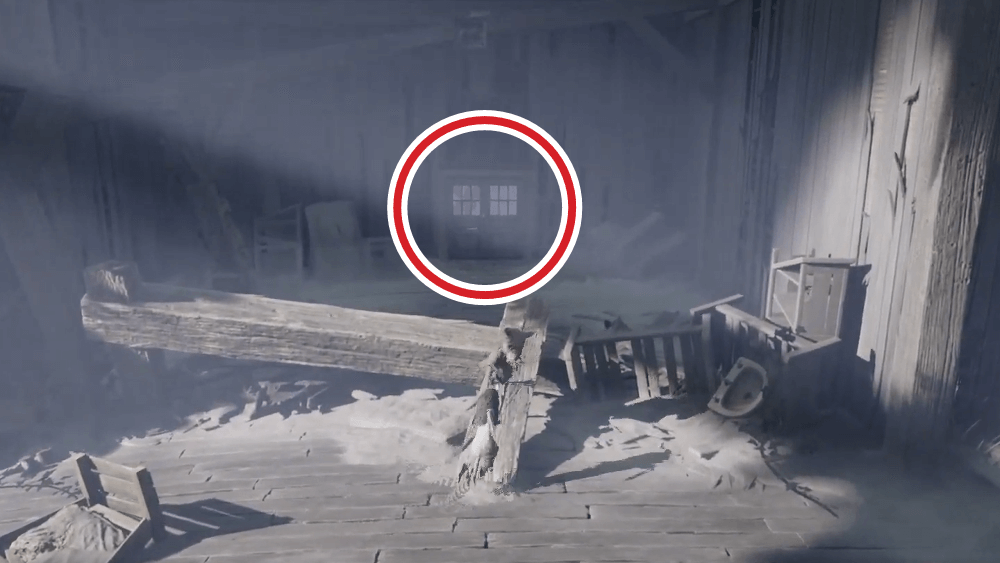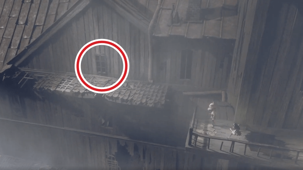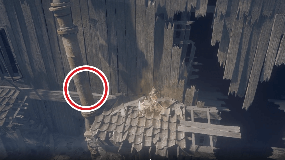 一番上まで登ってから屋根へ出て、パイプ伝いに移動しよう。しばらく進むと窓があるため、押して開いて屋根裏へ入る。