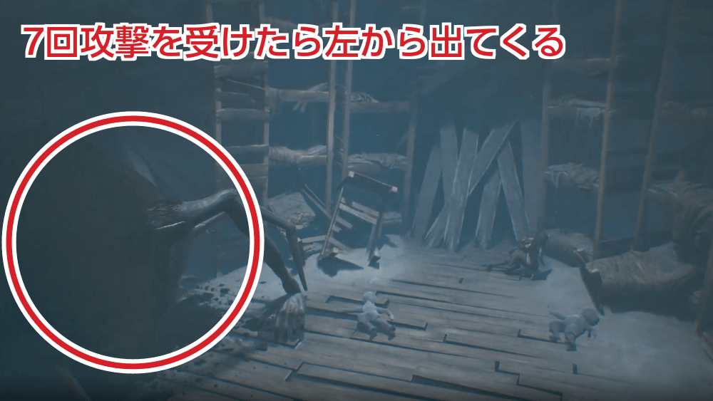 母グモは、7回槍を投げて攻撃すると撃退できる。子グモが投げてきた槍を拾って、母グモを攻撃しよう。7回攻撃を当てたら左側から母グモが出てくるため、右側へ回避しておくとよい。