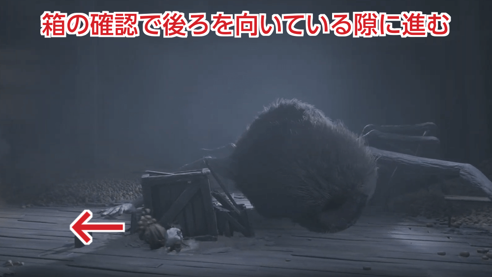 落ちた後は母グモ(マザー)が飛び出してくるため、見つからないように箱の裏に隠れよう。母グモ敵が奥を向いた瞬間にしゃがみ移動しながら次の箱の側へ移動する。