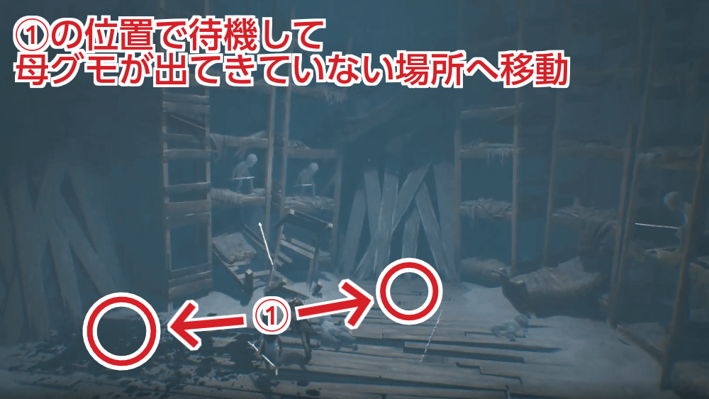 母グモの攻撃は、別の入り口前までは敵の攻撃が届かない。①の位置で待機して、攻撃の予兆があったら別の入り口へ移動して回避しよう。