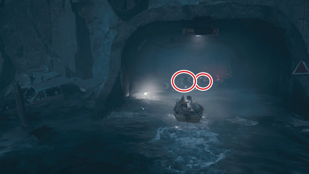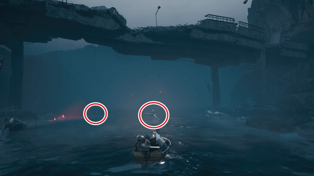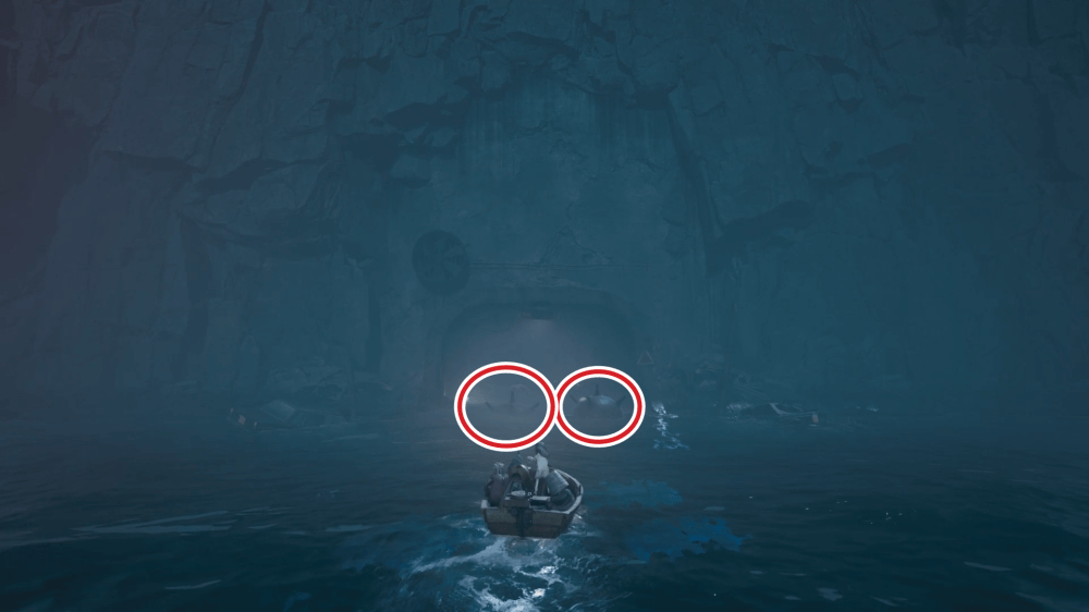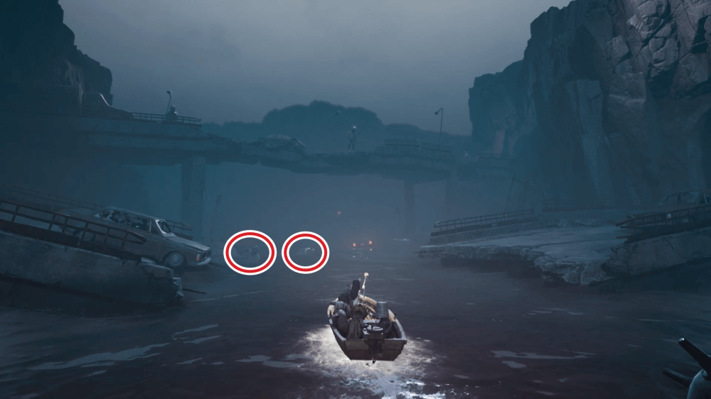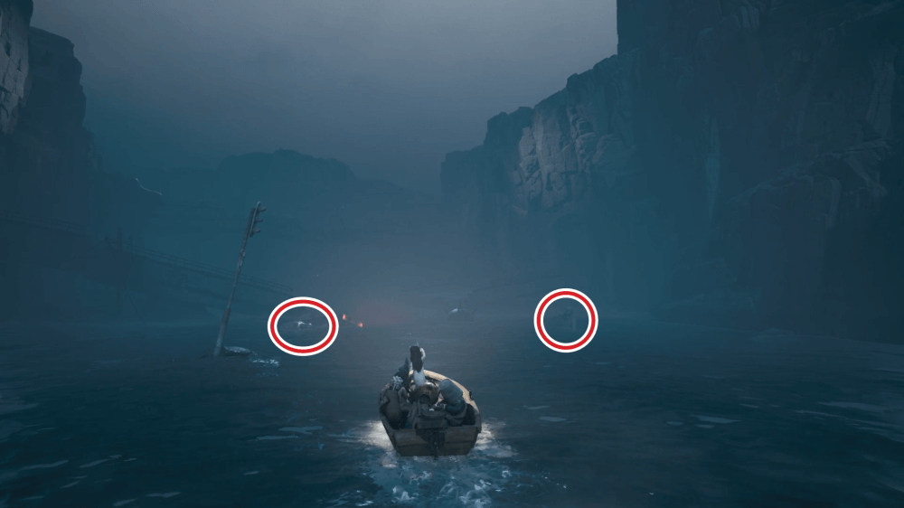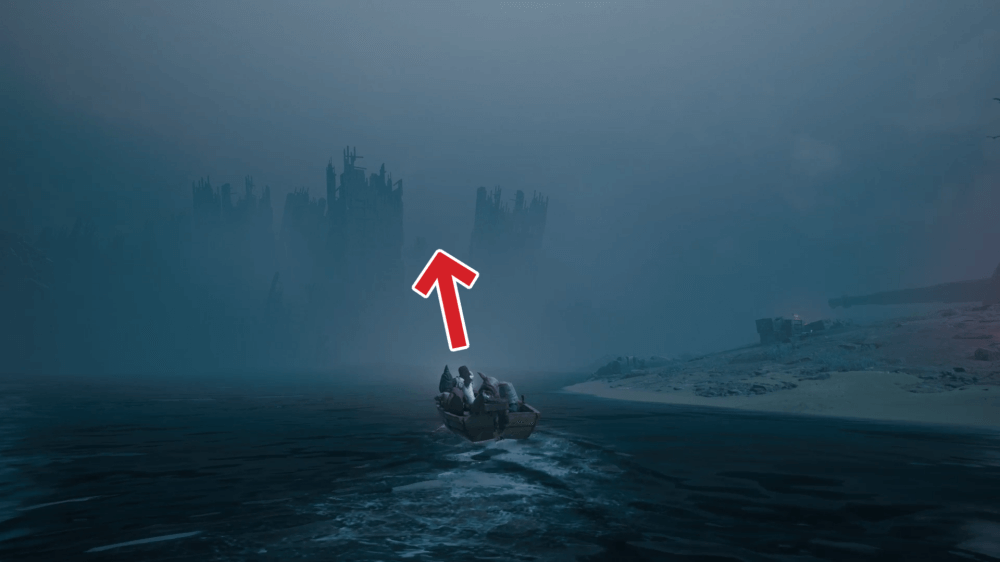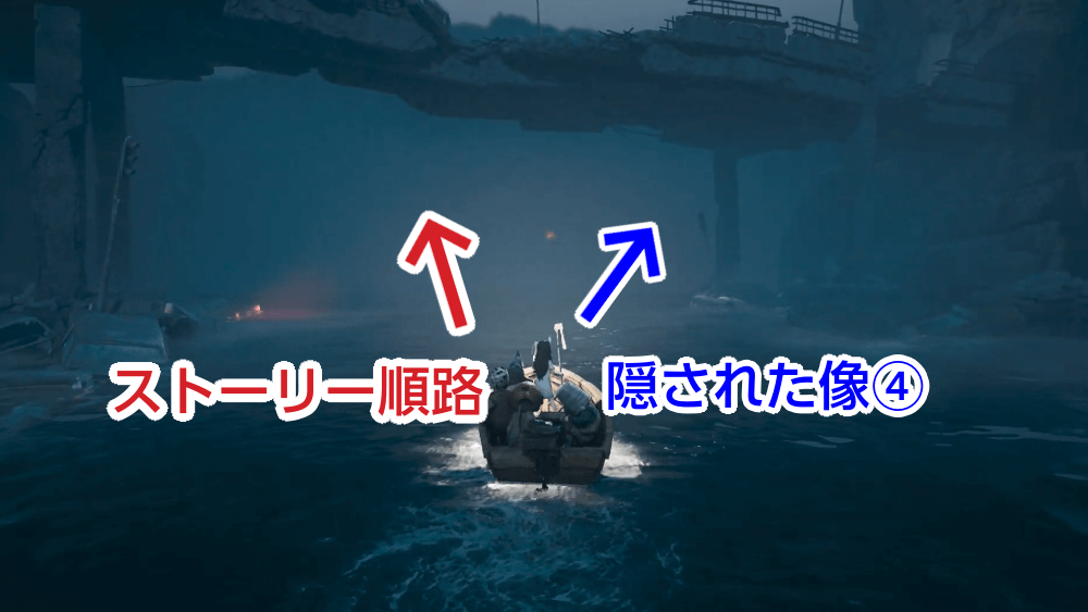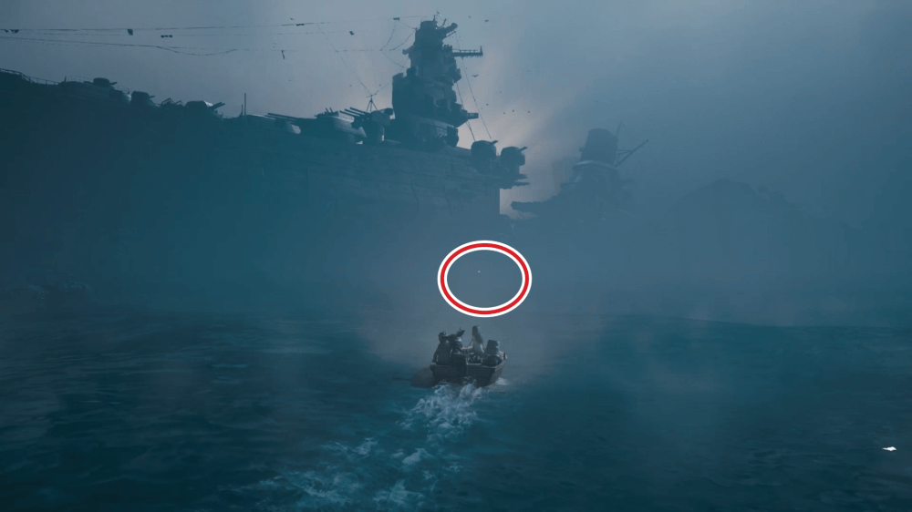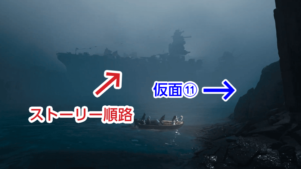 船に乗ったら、先ほど怪物を倒した先の廃墟の間に向かおう。大砲の向きを動かしてなければ、砲塔の方向を目印にすればOK。道中にある機雷に当たらないように慎重に進もう。