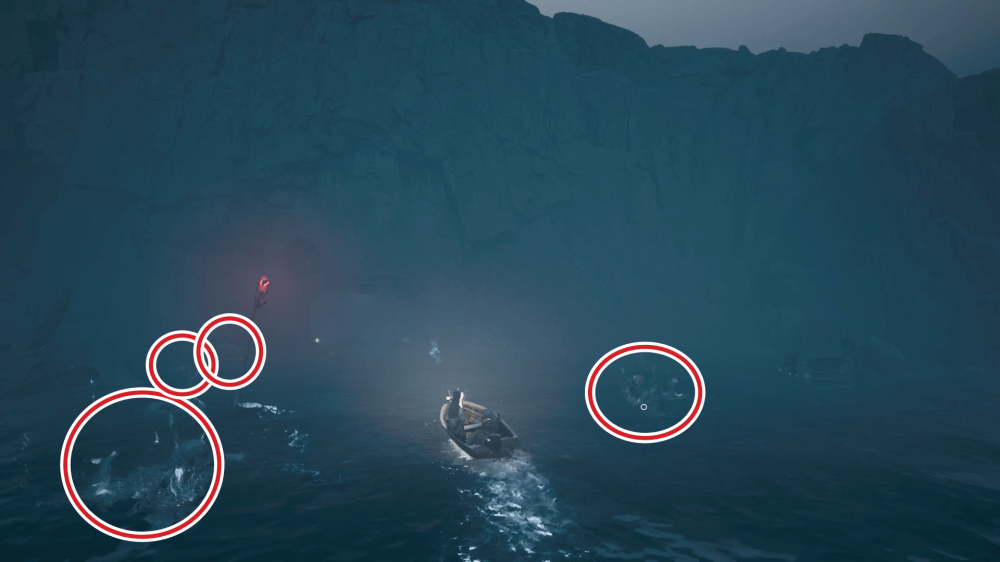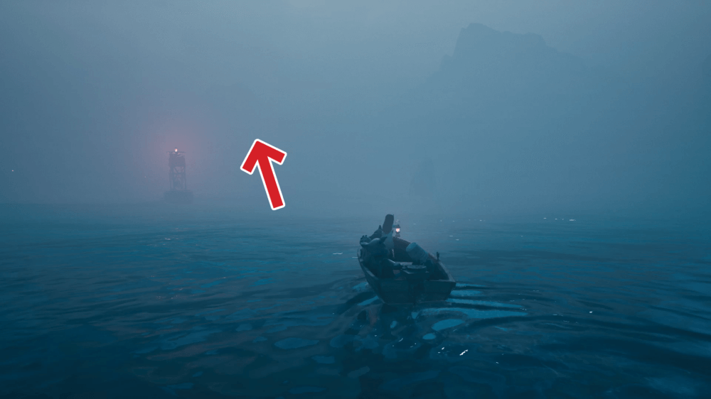 船に乗ったら、砂浜と垂直の方向へ進み、赤い光を通り越そう。しばらく進むと再度赤い光が見え始め、島に上陸できる。