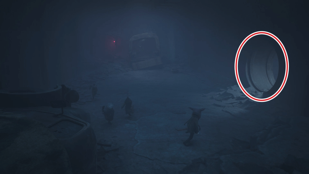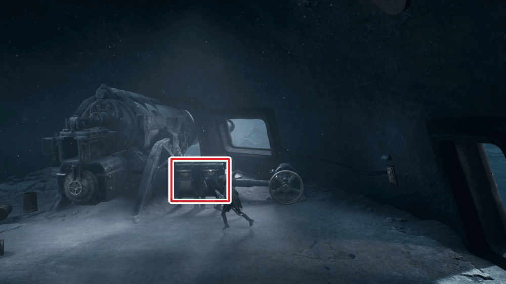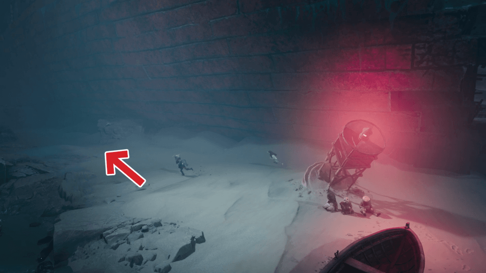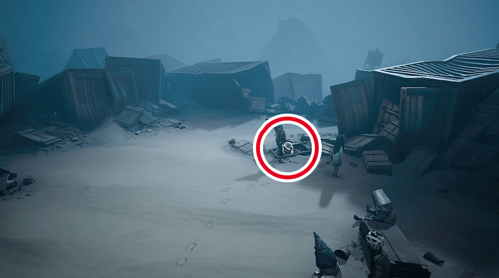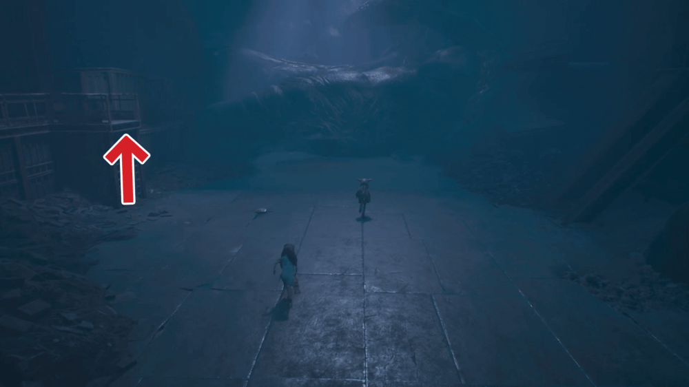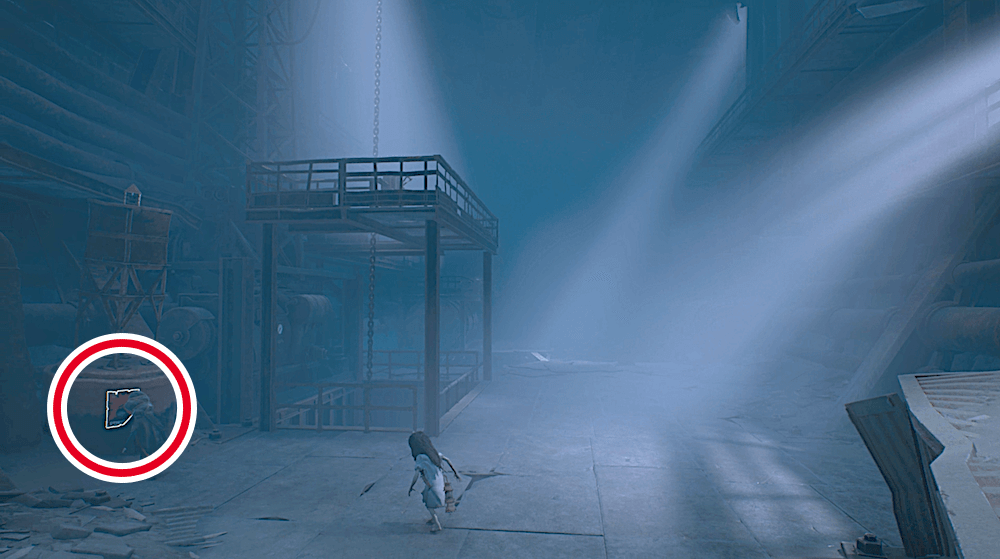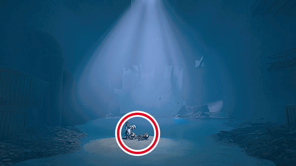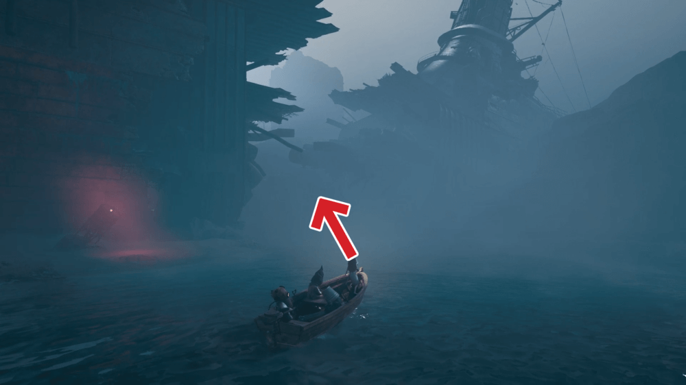 真っすぐ先へ進むと巨大な船が前方に見えてくる。船のふもとにある赤い光の場所までたどり着こう。