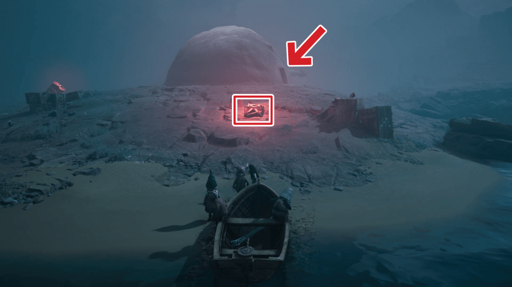 島に着いたら上の箱に入っている砲弾を拾おう。砲弾を拾ったら、丘の上にある丸いドームまで砲弾を持ち運ぶ。