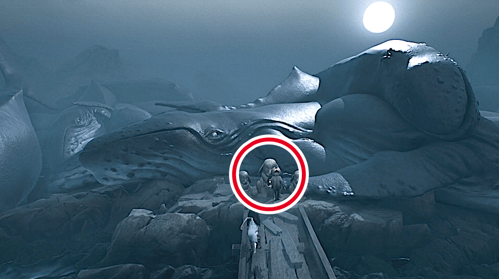 扉の先に進むと、奥にクジラが倒れているのが見える。クジラは一旦無視し、左の高台へ登って道なりに進もう。