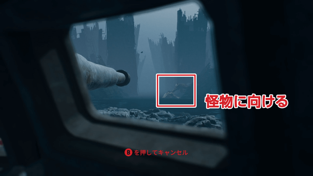 窓の下にあるハンドルを操作すると、大砲の向きを変えられる。奥に廃墟が並んでいる景色の手前で動いている怪物に照準を合わせよう。