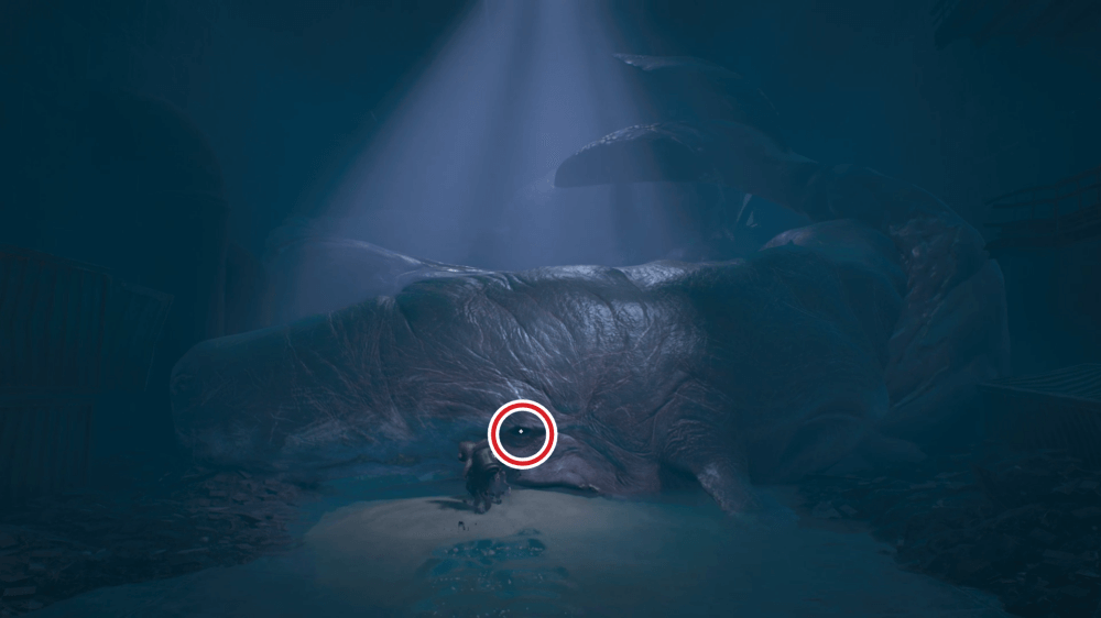 扉を通ったら道なりに奥へ進み、途中の右の大穴に入って奥へ進もう。最奥の右手に怪物が横たわっており、怪物の左目を剥ぎ取れる。