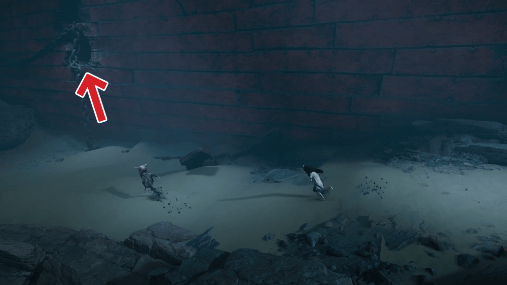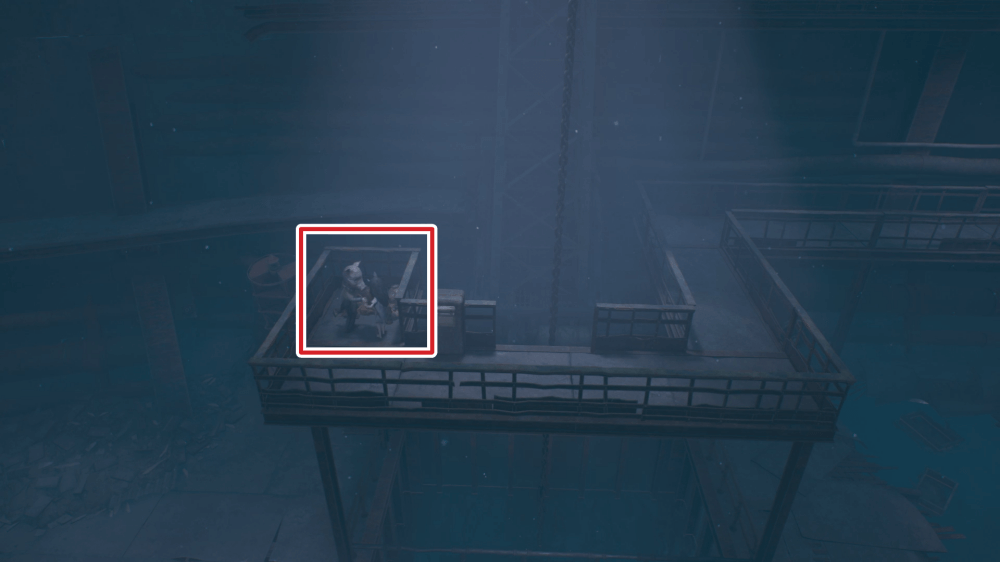 先に進み巨大な鎖から船の中に入り奥に進もう。中に入った後は下に降りて1本橋を渡り、2人で左の高台に登る。
