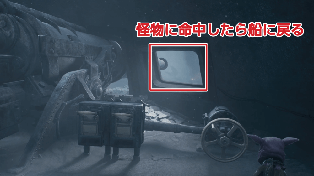照準を合わせたら大砲に戻り、2人でレバーを引いて発射しよう。弾が命中すると怪物の悲鳴が聞こえ、窓から怪物が海に沈む様子を確認できる。失敗したら、再度砲弾を拾うところからやり直そう。