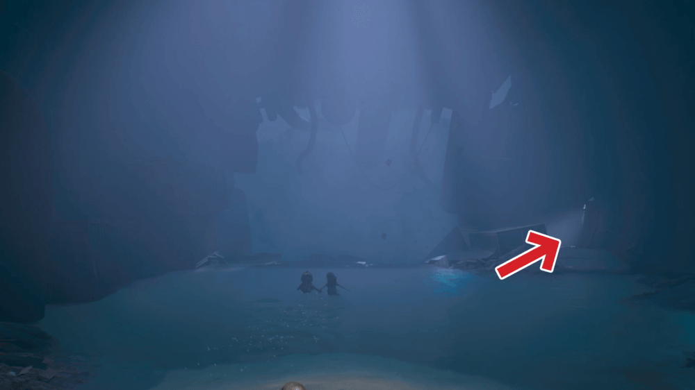 船に乗ったら、鯨が塞いでいた道の奥へ進む。しばらく直進し、赤い光が見えた地点で左折しよう。