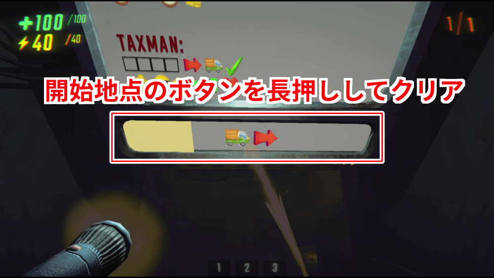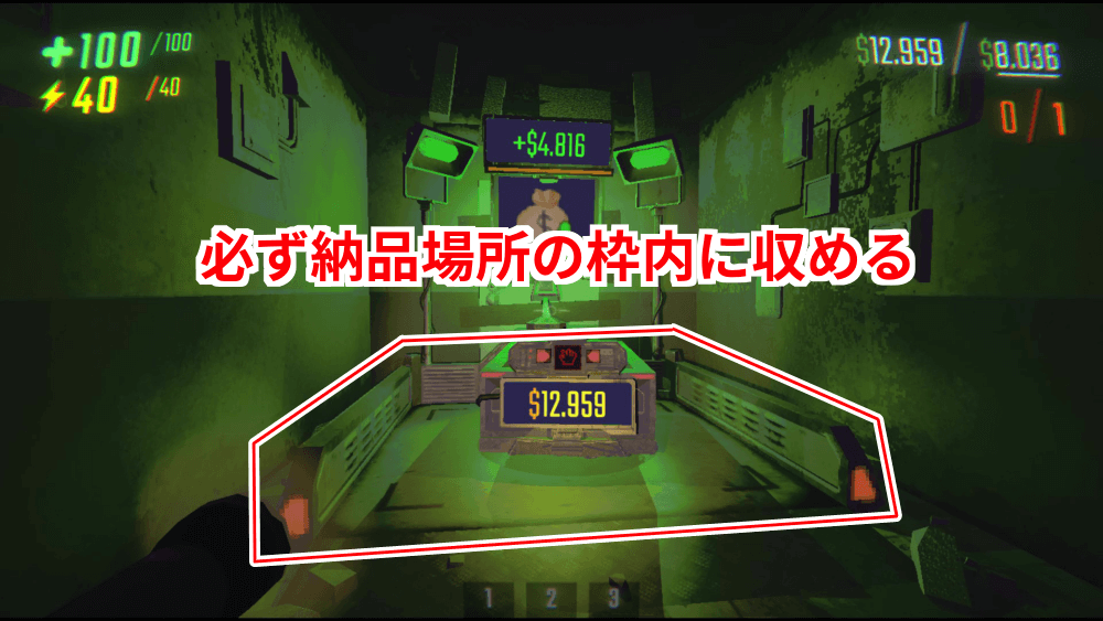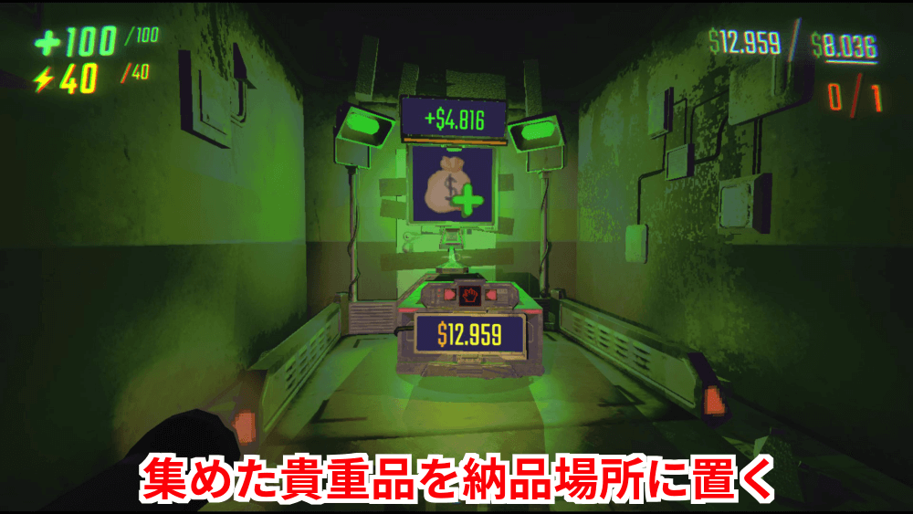 貴重品をカートに集めたら、納品場所まで運んでカートごと納品場所に置くと納品できる。金額ノルマ以上の貴重品を納品すると、プレス機が降りてきて納品が完了する。