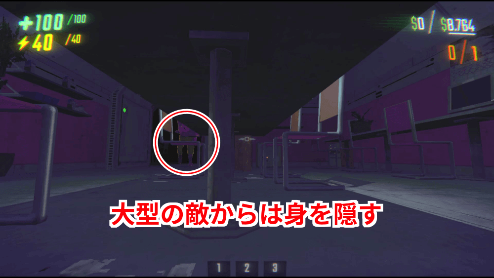 武器がない状態で敵と遭遇した場合は、身を隠してやり過ごそう。武器なしで倒せる敵は一部の小さい敵のみであるため、大型の敵を見かけたら必ず避けよう。