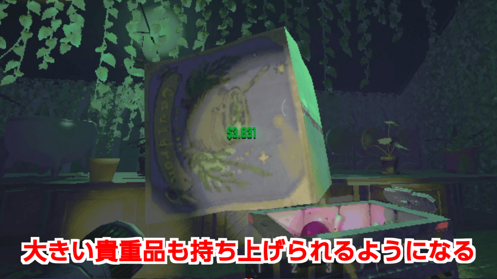 STRENGTHを上げると、重い貴重品や敵を動かしやすくなる。4まで強化すると、持ち上げられる敵が増加し、敵の対処が楽になるため、4を目安に強化を進めていくと良い。