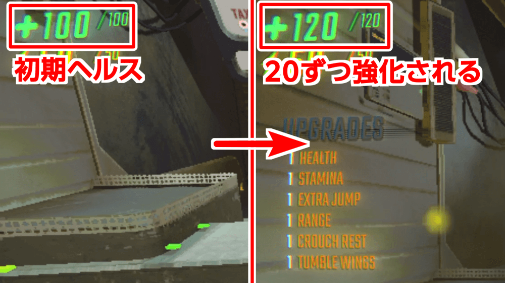 アップグレードは、HEALTH UPGRADEを最優先で上げよう。1回でも強化すれば、100ダメージの攻撃を耐えられるようになるため、生存率が格段に上がる。ショップに並んでいれば、毎回購入しよう。