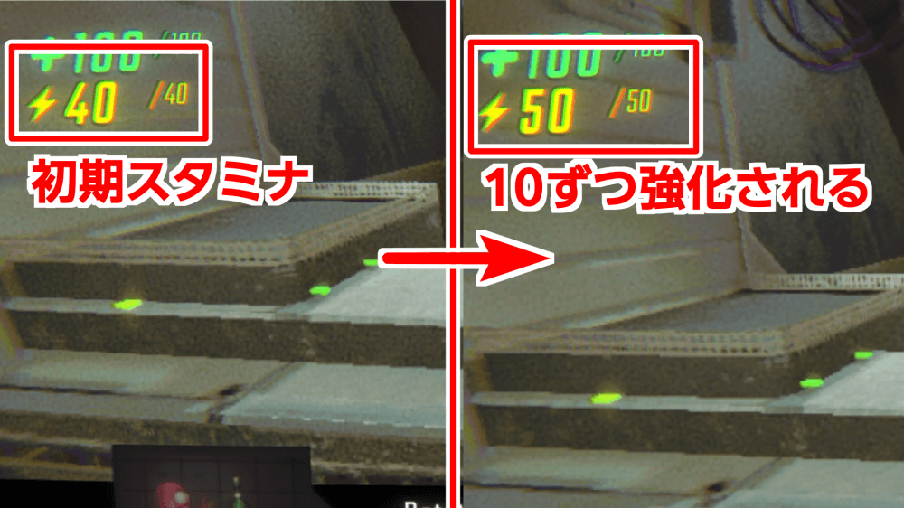 ソロ ★★★☆☆ マルチ★★★☆☆・しゃがみ時のスタミナ回復速度が増加 ・スタミナ強化より効果を実感しやすい ・1~2回以上強化するのがおすすめ |