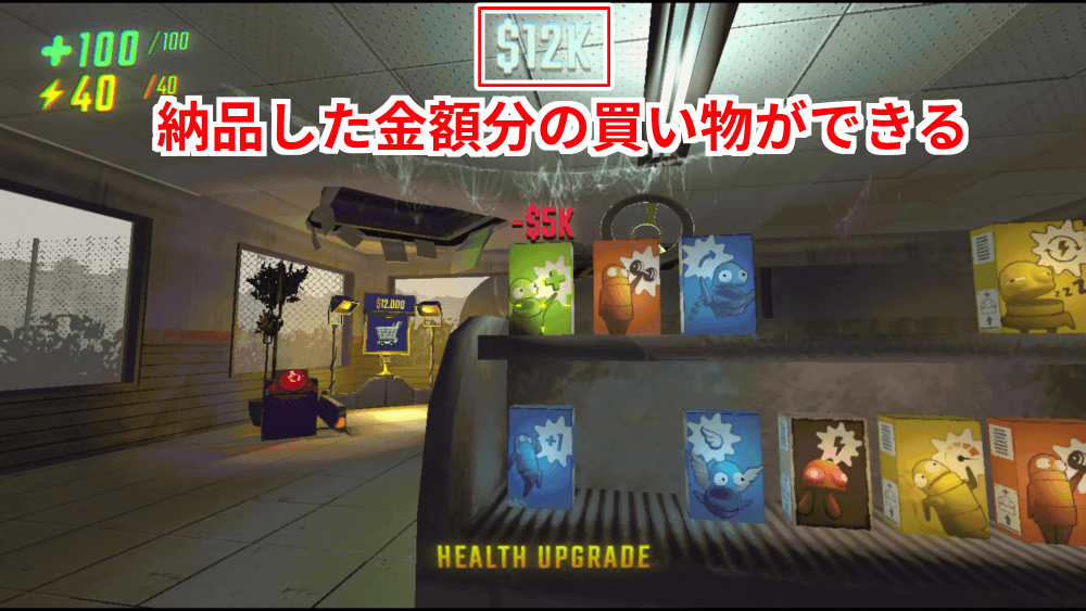 集めたお金は、ステージクリア後にショップでの買い物に使う。クリアしたステージで納品したお金で買い物するため、ノルマを超過して納品しておくと、買い物に使えるお金が増える。