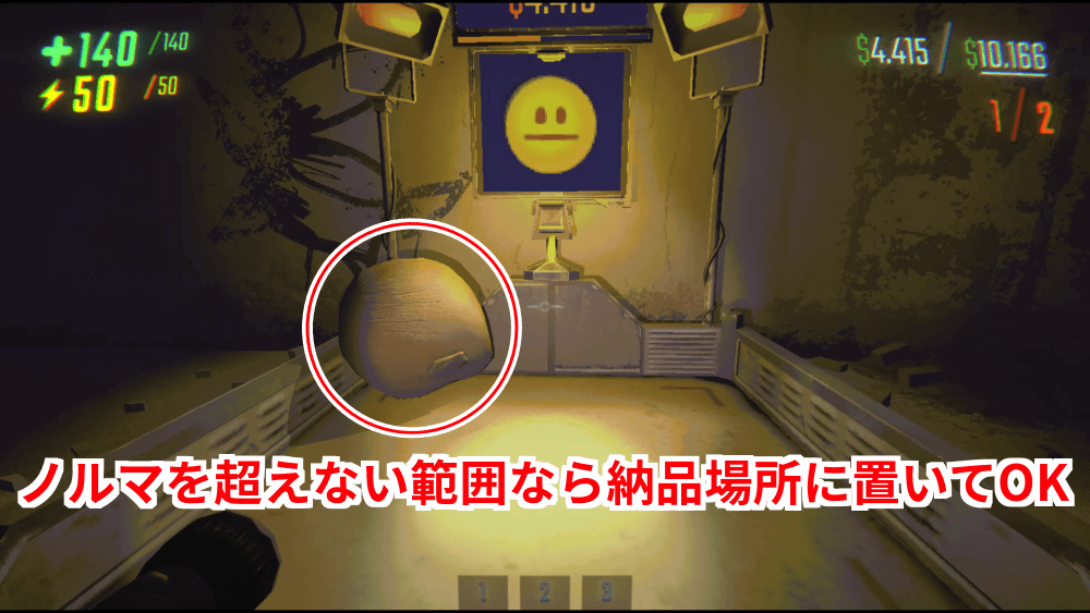 カートに入らない大きい貴重品は高価なものが多く、納品場所に直接置くと1つでノルマを超えてしまう場合もあるため、納品場所の近くに一旦置いておくのがおすすめ。カートを納品する時にまとめて納品すれば、ノルマを超過した分は金袋になり、運びやすくなる。