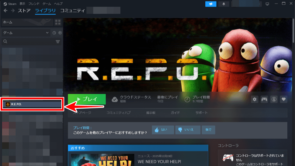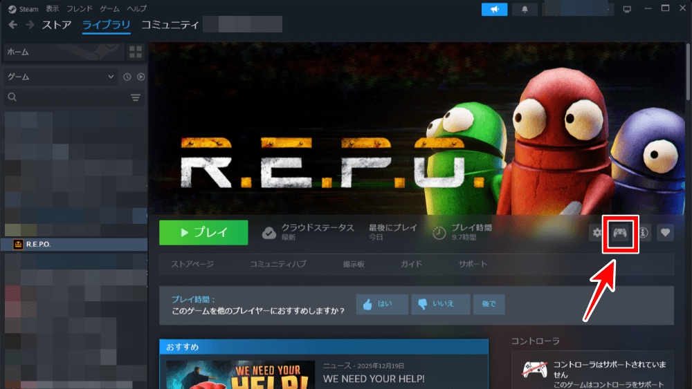 コントローラーの設定は、ゲーム内では行えず、Steam側で行う必要がある。まずはSteamのライブラリを開き、REPOのページに飛ぼう。