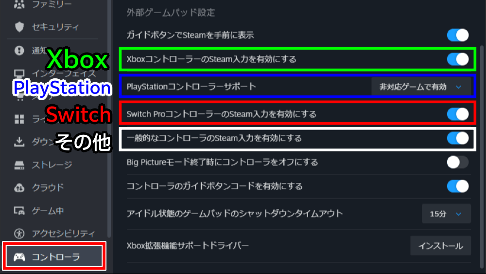 「コントローラ」の項目を開き、使用するコントローラーの欄を有効化しよう。PlayStationコントローラーのみ、「PlayStationコントローラーサポート」の欄が、「非対応のゲームで有効」になっていればOKだ。
