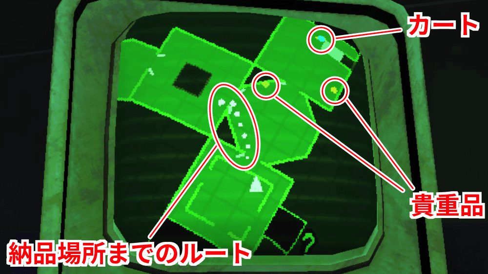 Tabキーを押すと、マップを開ける。マップ上では、一度見つけた貴重品の場所や納品場所までのルートを確認可能だ。効率的に貴重品を集められるため、探索中はこまめにマップを確認しよう。