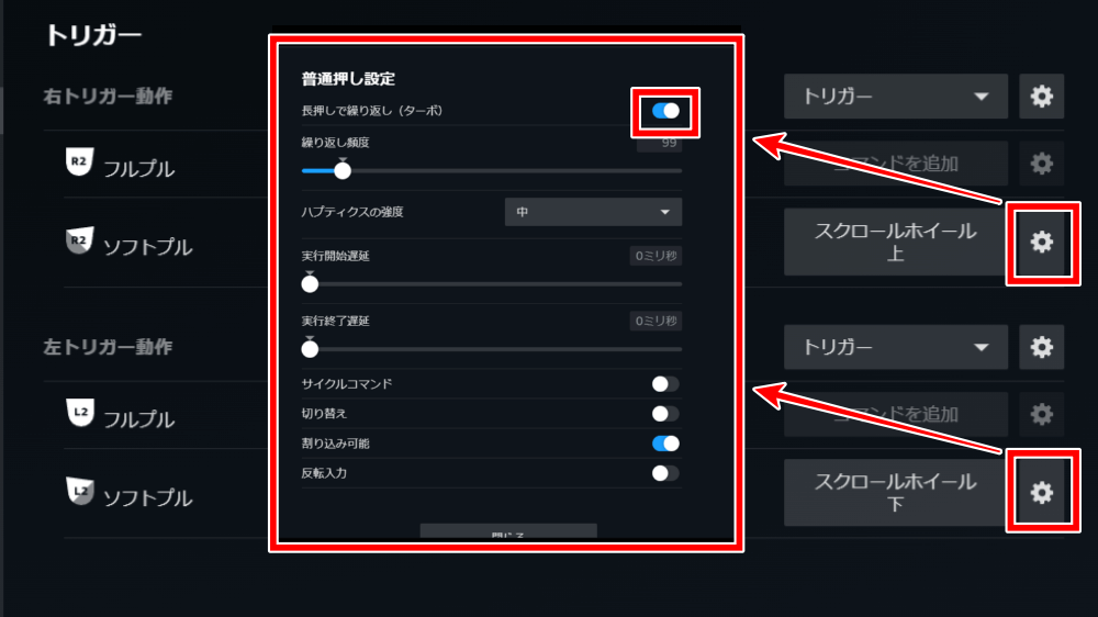 アームの伸縮操作は、デフォルトだとマウスホイールのように動かせないため、別途設定が必要だ。まずは、アーム伸縮に割り当てたボタンの横にある歯車マークを押し、ボタン個別の設定を開こう。「長押しで繰り返し(ターボ)」の項目を有効にすれば完了だ。