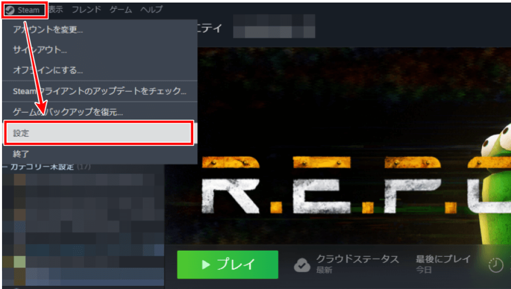 コントローラーが反応しない場合は、Steamの設定を見直すと対処できる。Steamを開いたら、画面左上の「Steam」から設定を開こう。