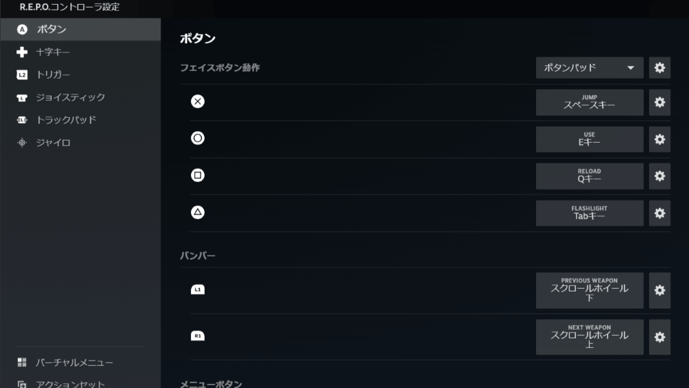 SteamでREPOのページを開いたら、画面右側のコントローラーマークを押し、コントローラーの設定画面を開こう。歯車マークなどが並んでいる場所の近くだ。