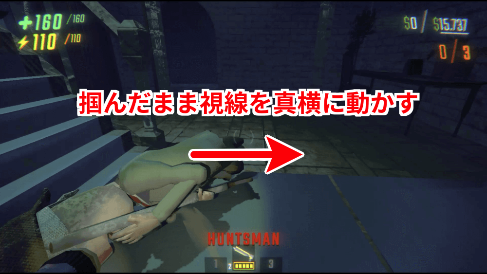 敵を引きずる際の視点は、上や下ではなく真横に移動させる。敵を転がすように引きずる必要があるため、正しい向きに力が掛かるよう、上や下ではなく真横に視点を動かすように意識しよう。
