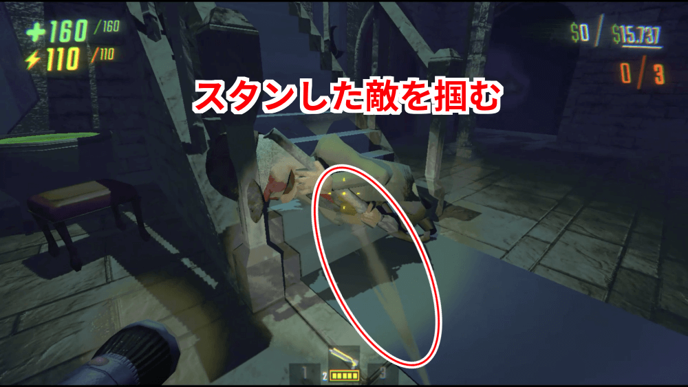 2スタン状態の敵を左クリック長押しで掴む