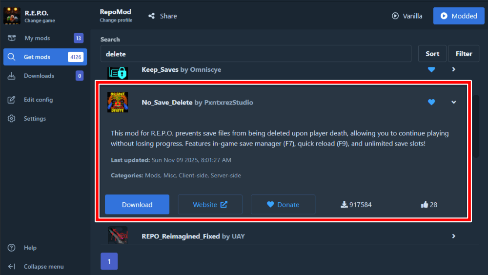 次に、「No Save Delete」をダウンロードしよう。ゲームオーバーになった際のデータ削除が無効化され、同じレベルから何度でもやり直し可能になる。