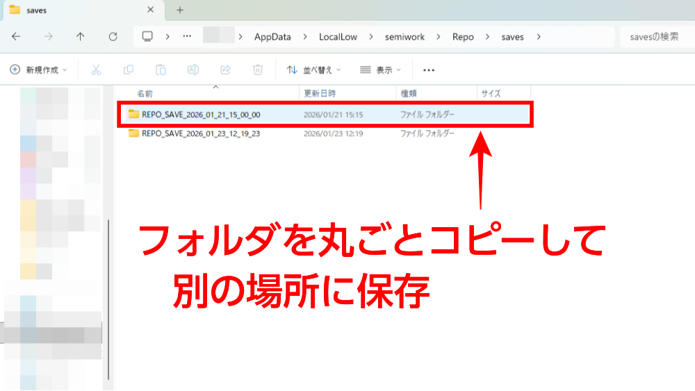Repoフォルダを開いたら、「saves」内フォルダをコピーして、別の場所に保管しよう。保管場所は、ドキュメントなどの分かりやすい場所に、「Repo_バックアップ」のような一目でわかる名前のファイルを作るのがおすすめだ。