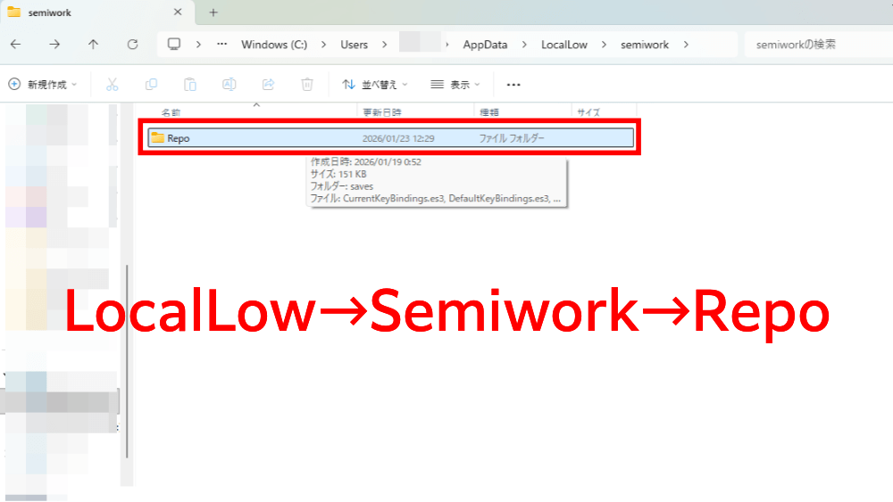 「LocalLow」→「Semiwork」→「Repo」の順で、Repoのフォルダを開こう。AppDataには重要なデータが大量に保存されているため、ほかのフォルダは触らないでおくのがおすすめだ。