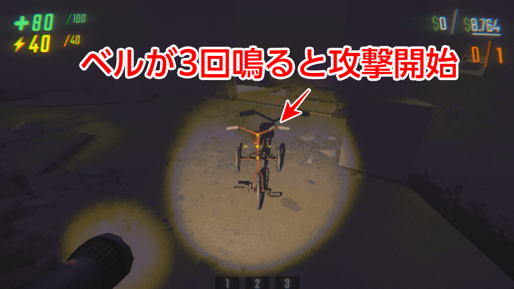 三輪車を正面から掴み、マウスホイールでアームを伸ばしながら、後ろに下がって距離を取る方法も有効だ。後ろに下がる際、ダッシュやジャンプは必要ない。失敗すると大ダメージを受けるため、ゲームに慣れてきてからチャレンジしよう。