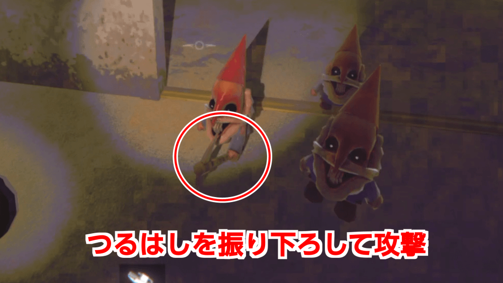 GNOMEは、つるはしを叩きつけて攻撃してくる。攻撃範囲が狭いうえ、ジャンプでも回避できるため、動き回っていれば当たらない。プレイヤーへの攻撃というよりも、貴重品へのダメージが深刻になりやすい攻撃だ。
