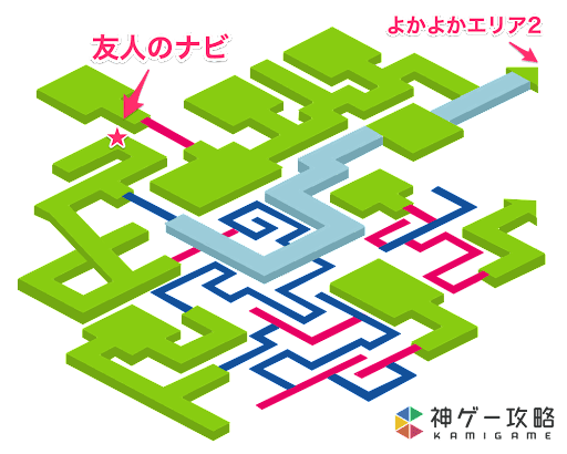 よかよかエリア1へは、「メイルのHP」からショートカットで「よかよかスクエア」へ行き、「よかよかエリア2」の青色の床を頼りに進んでいくと到着できる。途中で細い道を通るため、ナビカスに「プレスプログラム」を入れておこう。