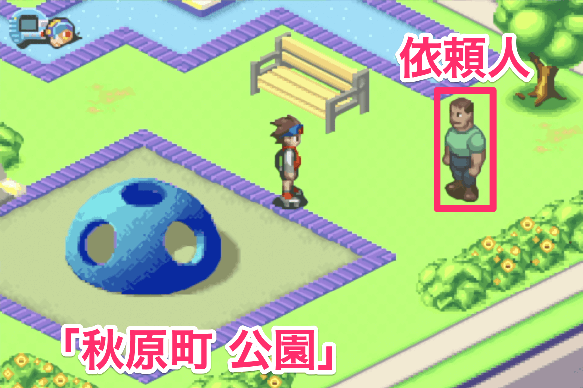 掲示板で依頼を受けたら、秋原町の公園にいる男性と話そう。よかよかエリアにいる友達のナビを探すように言われる。