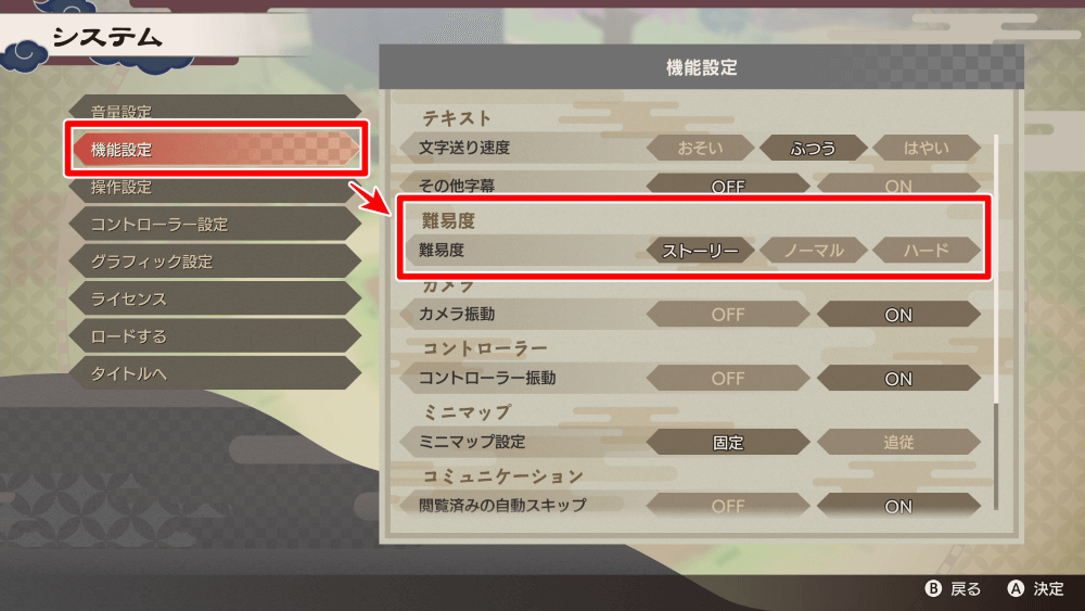 難易度は、システム画面から「ストーリー」「ノーマル」「ハード」の3つを選択できる。ゲームの途中からでも変更はできるため、戦闘が難しいと感じた場合など、好きなタイミングで変更しよう。