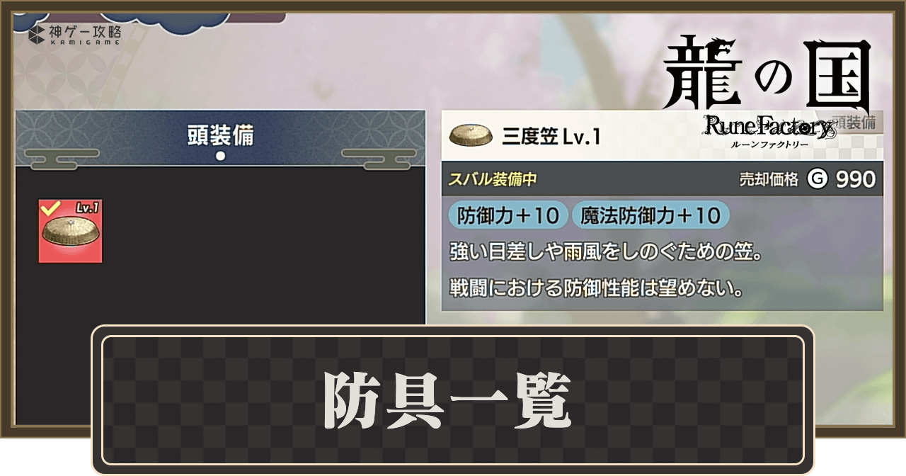 【龍の国ルーンファクトリー】防具一覧 編集者 龍の国ルーンファクトリー攻略班 最終更新日 2025/06/17 16:58 龍の国ルーンファクトリーの「防具」を解説。龍ファク防具の入手方法や効果に加え、防御力などのステータスや売却価格についても掲載しています。 装備関連記事 武器一覧 防具一覧 最強装備 防具一覧 三度笠頭入手メインストーリーで入手効果 -属性防御力魔防売却-1010990 見切りの行脚装飾品入手根の国・裏街道の宝箱から入手効果 ジャスト回避に成功すると一定時間、特定のステータスを上昇刺せる属性防御力魔防売却---- 鉄皮の肩当て肩当て入手春地方・廃神社の杜の宝箱から入手効果 -属性防御力魔防売却-15151,280 足軽の肩当て肩当て入手里の鍛冶屋で作成効果 -属性防御力魔防売却-25252,270 ラウンドシールド肩当て入手里の鍛冶屋で作成効果 -属性防御力魔防売却-35353,370 野武士の大袖肩当て入手里の鍛冶屋で作成効果 -属性防御力魔防売却-48484,850 頭巾頭入手里の鍛冶屋で作成効果 -属性防御力魔防売却-19191,920 丈長頭入手里の鍛冶屋で作成効果 -属性防御力魔防売却-25252,770 安物の腕輪装飾品入手春地方・廃神社の杜の宝箱から入手効果 -属性防御力魔防売却-1%1%205 鉄の腕輪装飾品入手里の鍛冶屋で作成効果 -属性防御力魔防売却-2%2%700 防毒の耳飾り装飾品入手里の鍛冶屋で作成効果 毒耐性+100%属性防御力魔防売却---4,250 麻痺封じの耳飾り装飾品入手里の鍛冶屋で作成効果 麻痺耐性+100%属性防御力魔防売却---4,250 忍びの肩甲肩当て入手里の鍛冶屋で作成効果 -属性防御力魔防売却-73736,620 マジックシールド肩当て入手里の鍛冶屋で作成効果 -属性防御力魔防売却-28628621,340 翠玉の肩甲肩当て入手里の鍛冶屋で作成効果 -属性防御力魔防売却風18318316,220 藍玉の肩甲肩当て入手里の鍛冶屋で作成効果 -属性防御力魔防売却水23323317,160 紅玉の肩甲肩当て入手里の鍛冶屋で作成効果 -属性防御力魔防売却火14114112,270 黄玉の肩甲肩当て入手里の鍛冶屋で作成効果 -属性防御力魔防売却地1011019,570 プラチナシールド肩当て入手里の鍛冶屋で作成効果 -属性防御力魔防売却-35135124,590 大将の大袖肩当て入手里の鍛冶屋で作成効果 -属性防御力魔防売却-51151133,440 天音の結び肩当て入手里の鍛冶屋で作成効果 -属性防御力魔防売却光60360339,740 妖魔の肩甲肩当て入手里の鍛冶屋で作成効果 -属性防御力魔防売却闇42142131,080 姫武将の鎧肩当て入手里の鍛冶屋で作成効果 -属性防御力魔防売却-51151133,390 草木の芽吹き肩当て入手里の鍛冶屋で作成効果 -属性防御力魔防売却地70370348,050 武将の肩飾り肩当て入手里の鍛冶屋で作成効果 -属性防御力魔防売却火81381358,090 大嵐の衣肩当て入手里の鍛冶屋で作成効果 -属性防御力魔防売却風96396367,550 雪零の鎧肩当て入手里の鍛冶屋で作成効果 -属性防御力魔防売却水1123112375,950 ムラサメの肩当て肩当て入手里の鍛冶屋で作成効果 会心威力+4%属性防御力魔防売却-40403,750 フブキの肩当て肩当て入手里の鍛冶屋で作成効果 水属性ダメージ+3%属性防御力魔防売却-40040025,000 舞手の神袖肩当て入手里の鍛冶屋で作成効果 ‐属性防御力魔防売却‐25932593167,040 金のかんざし頭入手里の鍛冶屋で作成効果 ‐属性防御力魔防売却‐53853834,700 泰平の指輪装飾品入手里の鍛冶屋で作成効果 全属性半減属性防御力魔防売却‐‐‐26,000 クリティカセブン装飾品入手里の鍛冶屋で作成効果 会心率+100%属性防御力魔防売却‐‐‐20,840 神代の御幣装飾品入手里の鍛冶屋で作成効果 獲得経験値-50%、神気自動増加+1%属性防御力魔防売却‐‐‐4,144 モコモコマフラー装飾品入手里の鍛冶屋で作成効果 HP自動回復+1.5%属性防御力魔防売却‐‐‐30,950