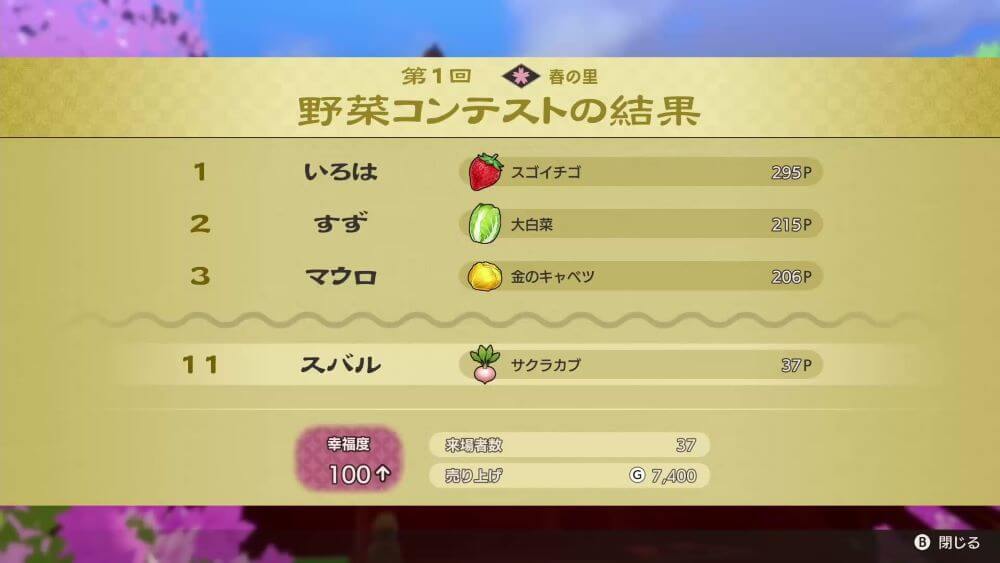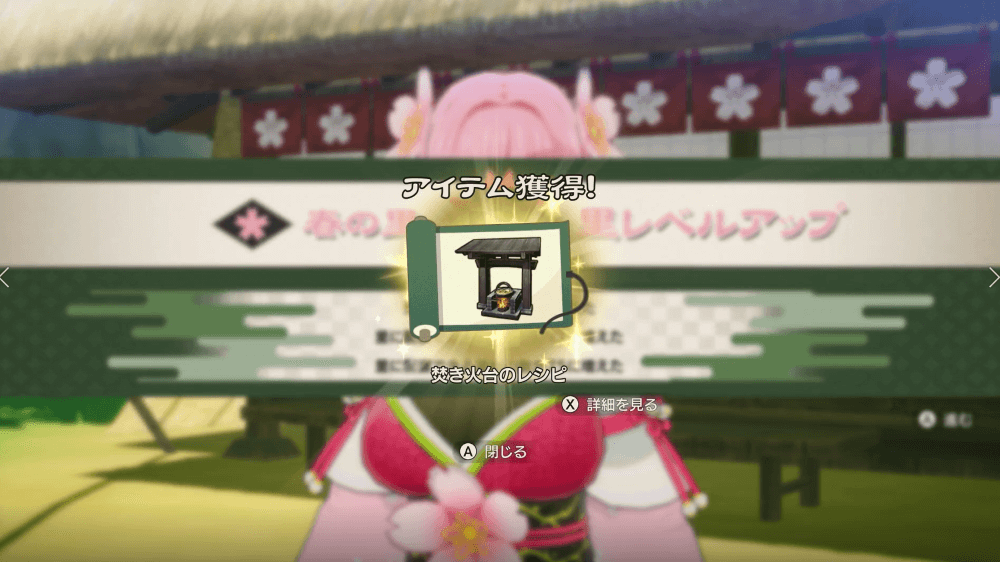 | 5 | 【人口】15 【施設】16 【置物】90・「春の石」が作れる ・「絵馬掛け」が作れる ・「桜の旗」が作れる ・鍛冶屋の品揃えが更新される ・いろは茶の品揃えが更新される |