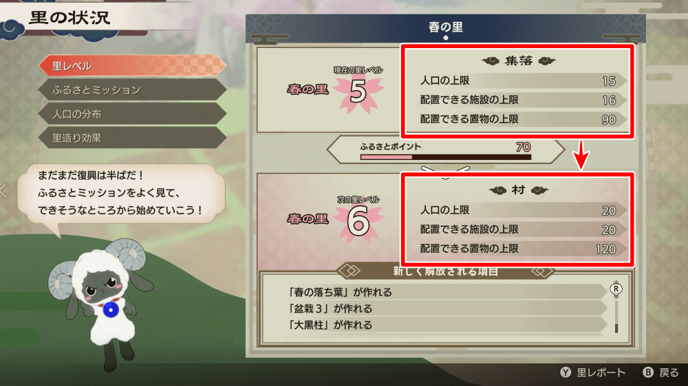 | 里の規模が拡大する人口、施設、置物の上限が増える |